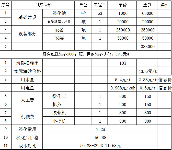海砂清洗機能很好的將海沙通過設(shè)備清洗達到淡化,完全達到國家施工質(zhì)量標準(氯離子含量≤0.06%),海沙淡化投資項目既有很好的社會效益、生態(tài)效益,更是達到大經(jīng)濟效益。那么海沙淡化成本有多高?下面是海砂淡化成本估算圖