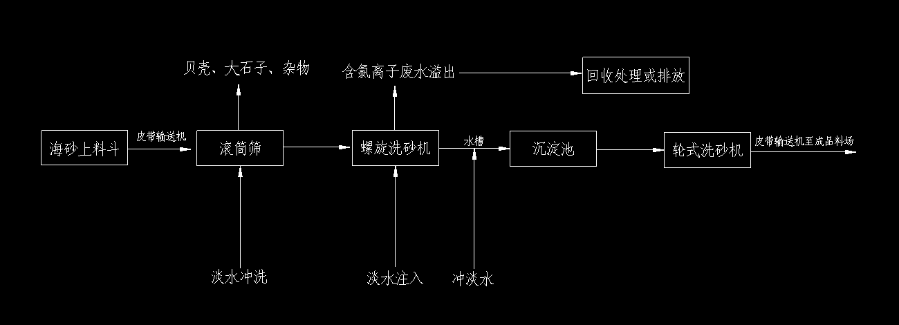 由圖可見,淡化海砂生產(chǎn)加工可操作性強、工藝簡單,先是滾筒篩的篩分處理(同時淡水沖洗),然后經(jīng)過螺旋洗砂機進入沉淀池,后由輪式洗砂機淘洗脫水后輸送至成品料場。
