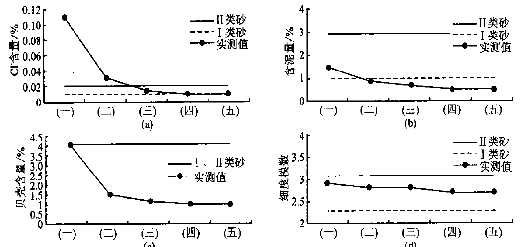 經(jīng)過實地檢測(見下圖)可知,一道和第二道加工工序非常關鍵,一道工序經(jīng)滾筒篩去除粗顆粒,粗貝殼等,(篩孔不大于8mm)加之淡水沖洗氯離子含量降低達70%左右,含泥量降低40%,貝殼含量降低了60%,檢測效果非常顯著。經(jīng)過第二道工序后氯離子含量降低15%,含泥量降低了12%,貝殼含量降低10%。海砂淡化綜合指標已經(jīng)全面達到二類砂標準,貝殼含量和含泥量已經(jīng)達到了一類砂標準。經(jīng)過第三道輪式洗砂機淘洗濾水后各項指標繼續(xù)降低,氯離子含量繼續(xù)下降3%,貝殼含量下降2%,而含泥量又大幅下降10以上。實測值為:氯離子0.01% 含泥量0.6% 貝殼含量1.1%。根據(jù)這個指標可以明顯得到結論:該生產(chǎn)線生產(chǎn)的淡化海砂作為二類中砂用于C30--C60的混凝土配制是完全沒有問題的,除細度模數(shù)之外其他指標均達到了一類砂標準。
